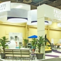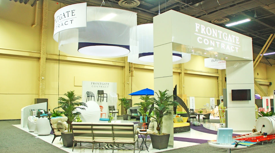 Stevens E3 was able to successfully design an environment that was clean, bright, and uncluttered with clean traffic flow that carrying attendees through the pavilion. The use of high gloss flooring, and gloss white laminate created a shine to the exhibit, and a look of luxury. A raised section of flooring 10 ft in diameter was created and lit to create a floating look to the platform that would feature a new product that Frontgate was bringing on to the market. Suspended fabric ceiling elements hung over the booth with the large purple cylinders being backlit, thus helping to create the overall environment and draw crowds of attendees. A large backlit sign with illuminated lettering and a large span across the centre of the exhibit was to be a feature entrance point. The exhibit and signage could be seen from multiple aisles away.