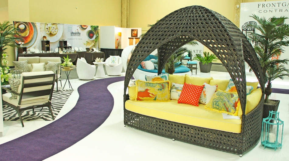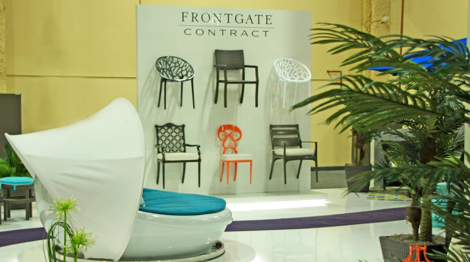 Provide a custom exhibit solution that was reflective of client’s luxury brand product line. Our client partner wanted to stand out on the floor and be set apart from their competition with the fit and finish of the exhibit. The booth was to be clean and modern, without looking commercial, and the booth space was to showcase equally both modern and traditional styles of outdoor furniture. It need to be modular in design, largely open in appearance, and despite lots of product to be on display, it should not appear cluttered. Frontgate Contract also wanted to develop a chair wall that would effectively display their chairs in a manner that would make them appear to be floating. The front entrance was to have a grand presence with a large logo treatment.